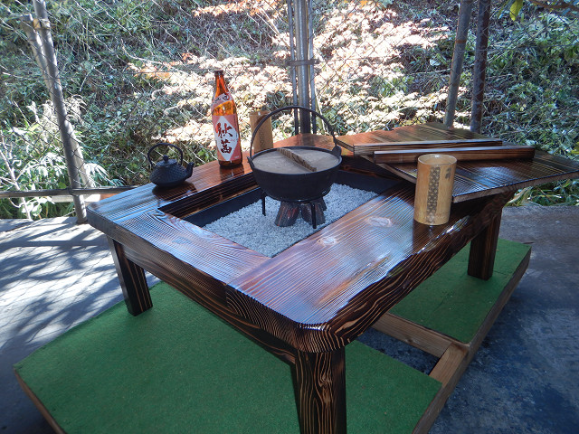 囲炉裏テーブルは全ての料理~炊飯も可能で暖も取れ、暗闇では僅かな明かりともなる。