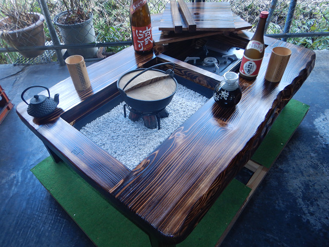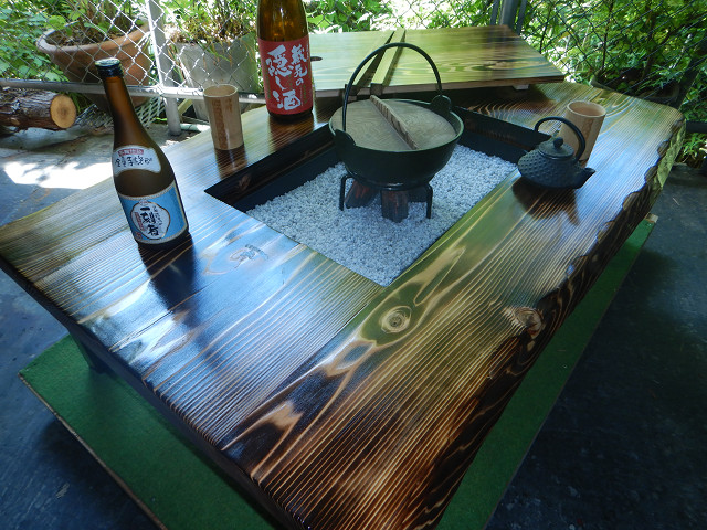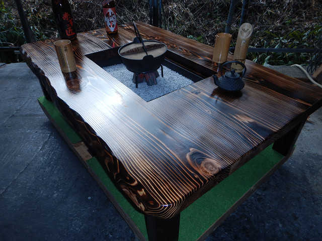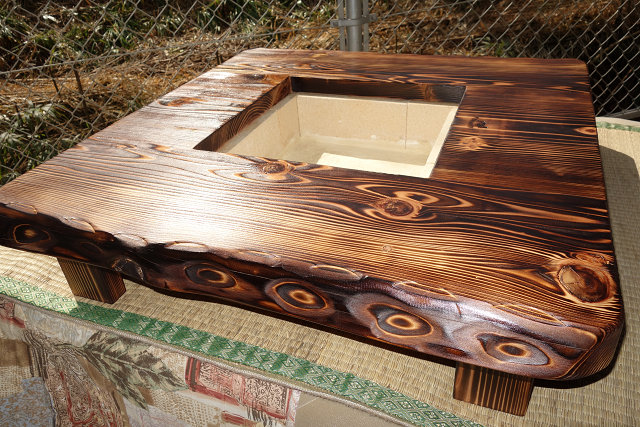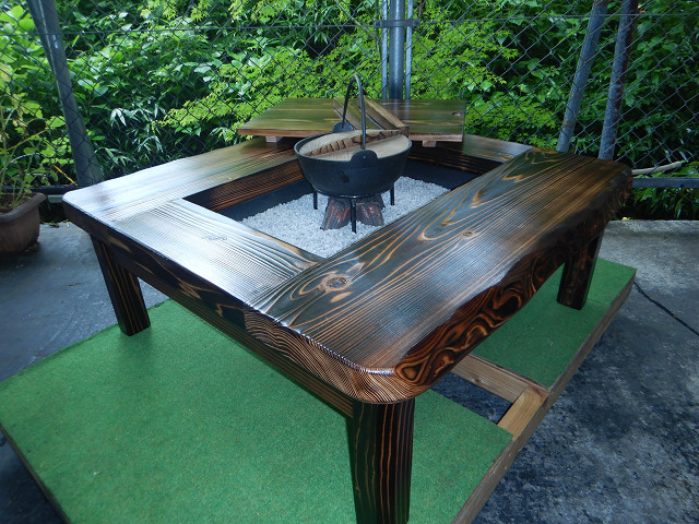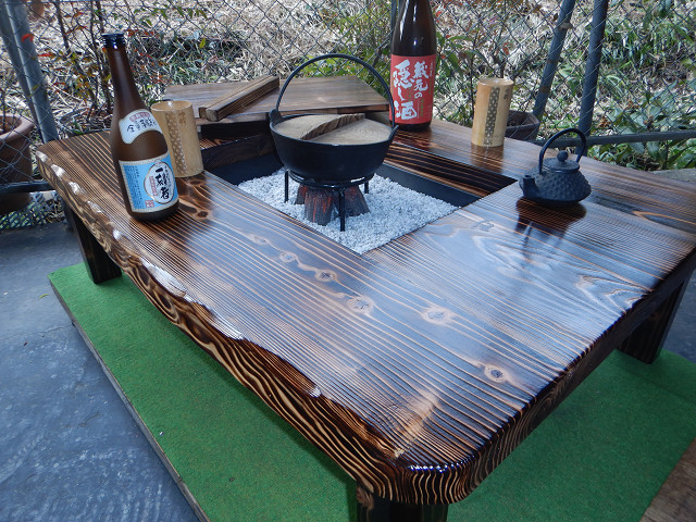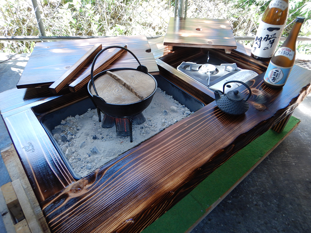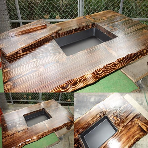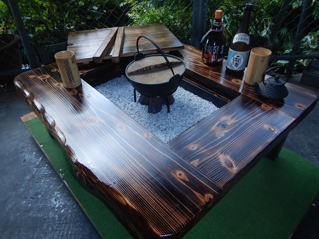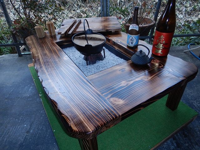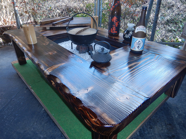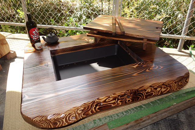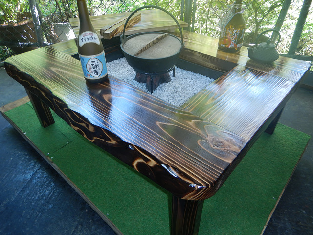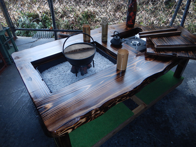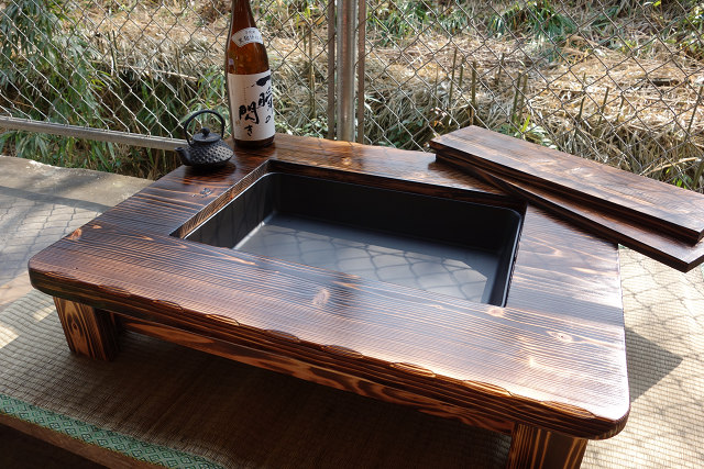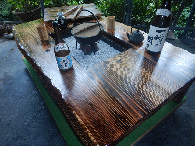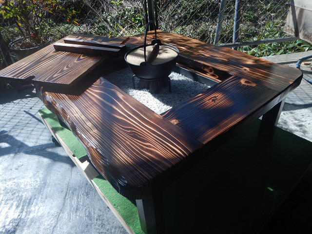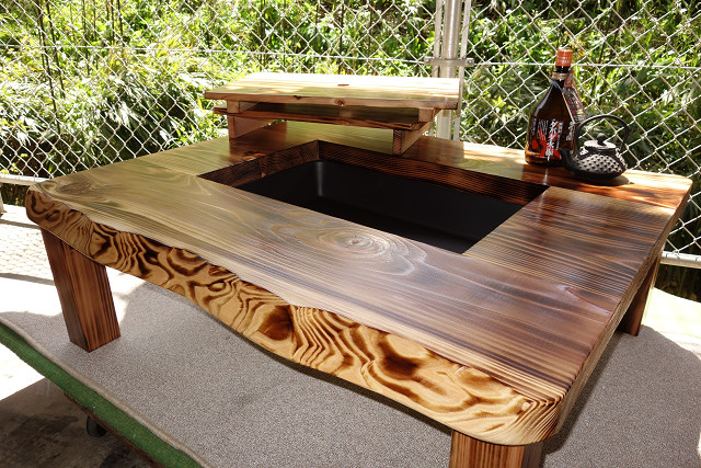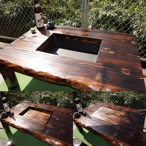<ホ> 囲炉裏テーブル脚折れ式(完成薄い焼き色タイプ炉蓋とコンロ等使用時の上げ底板を付属 (神奈川県相模原市のSM様)