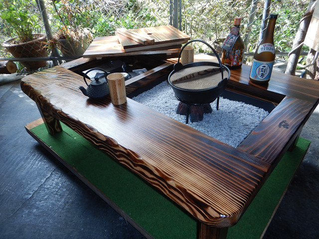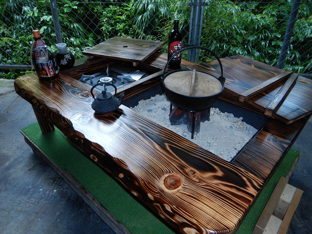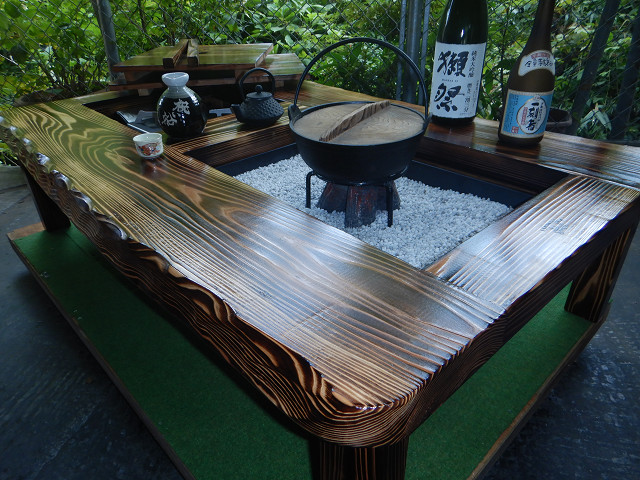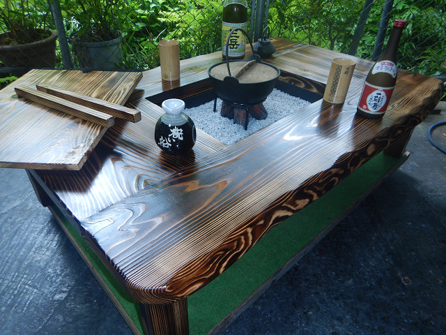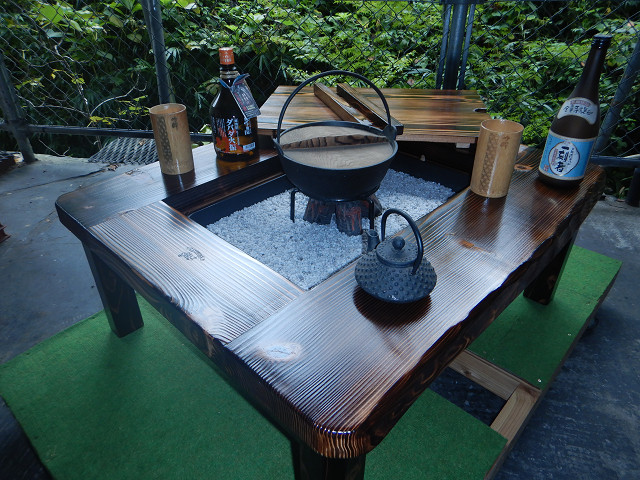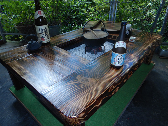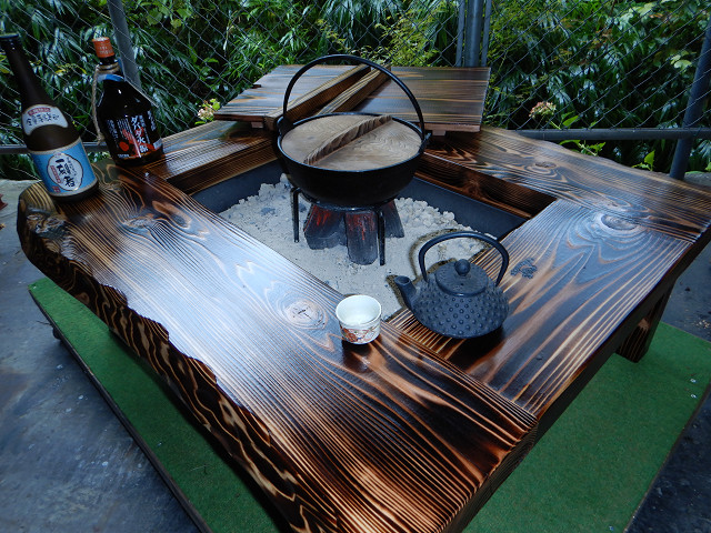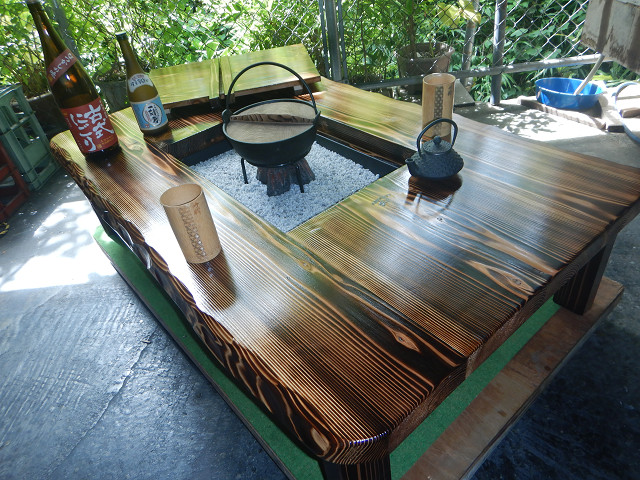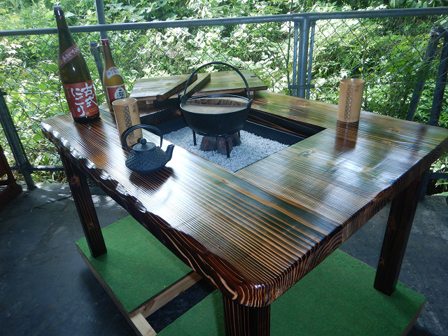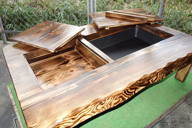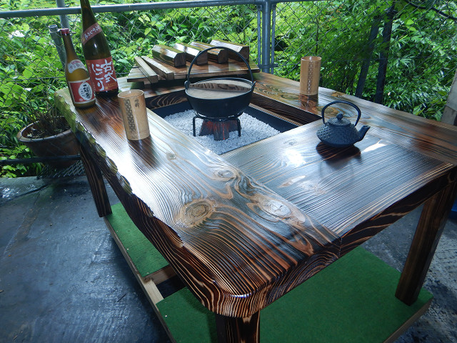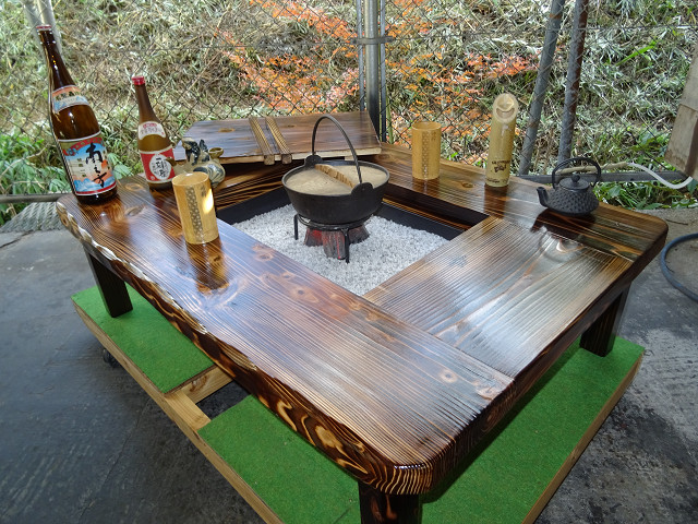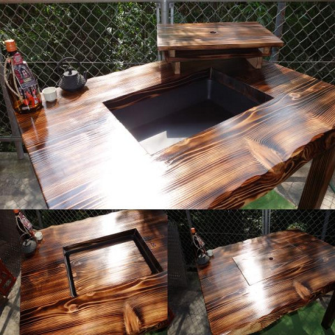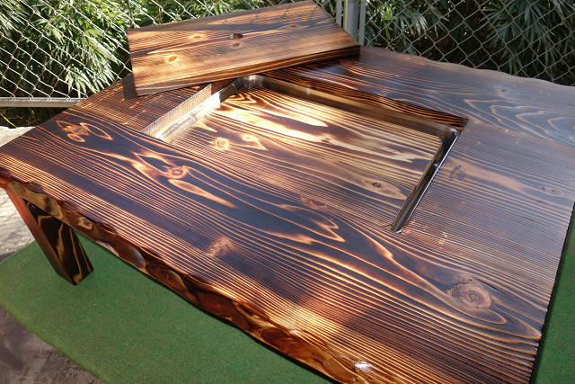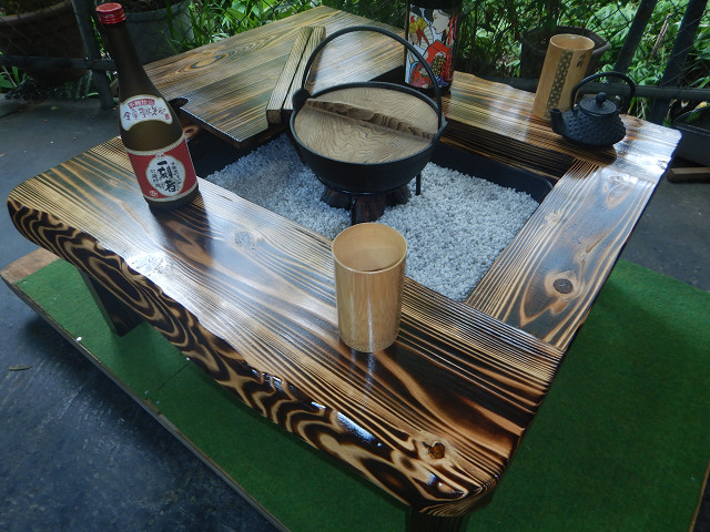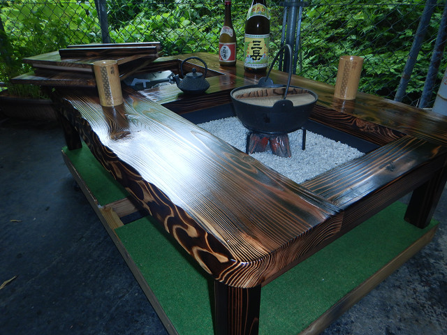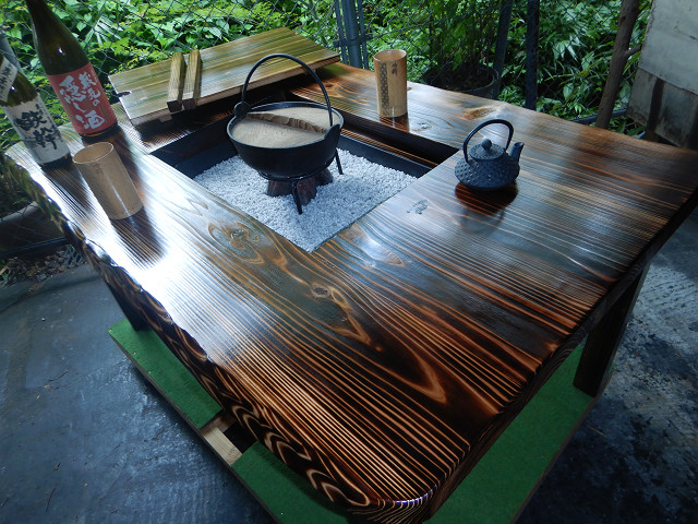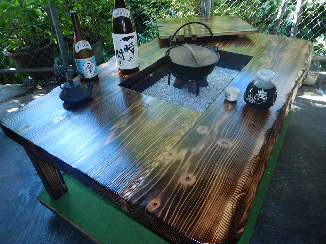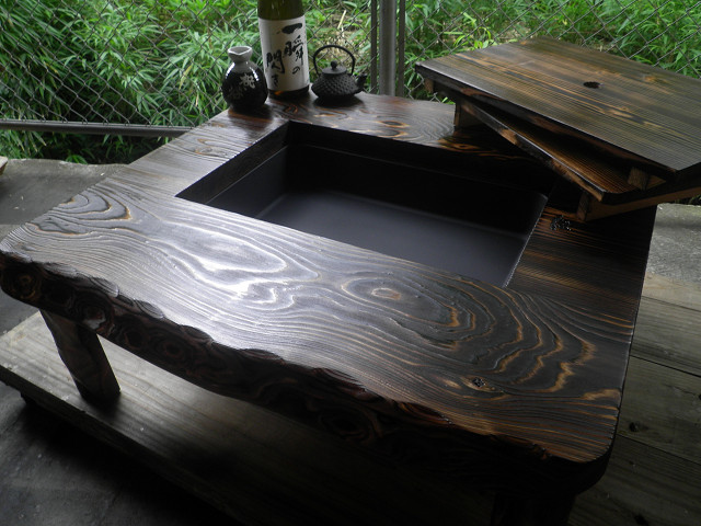 <ホ> 囲炉裏テーブル脚折れ式(完成薄い焼き色タイプ炉蓋とコンロ等使用時の上げ底板を付属 (神奈川県相模原市のSM様)