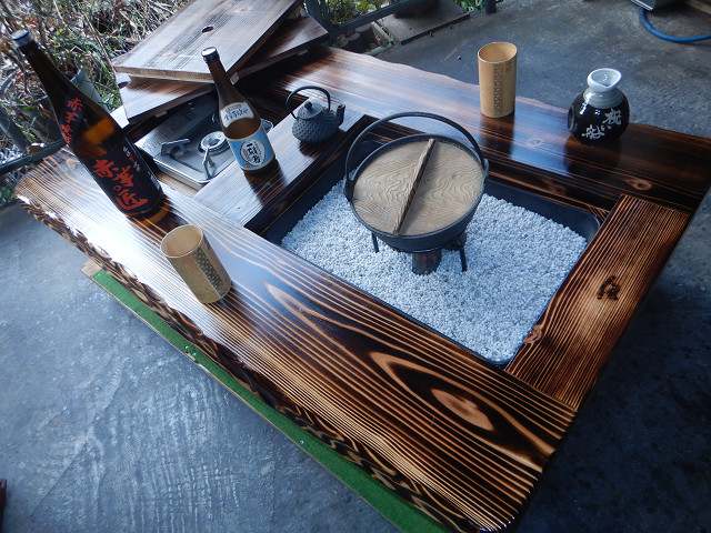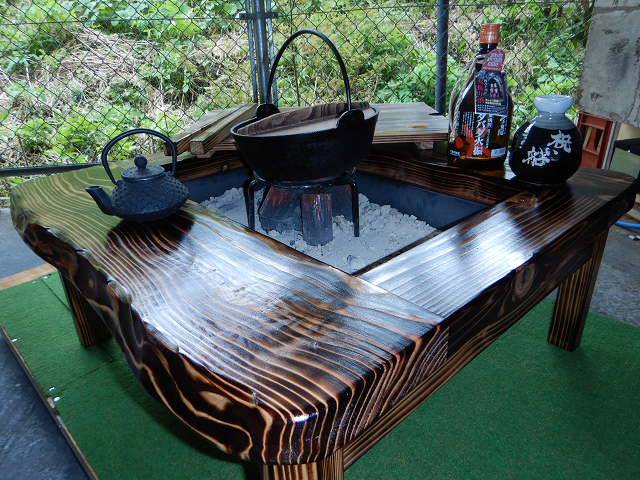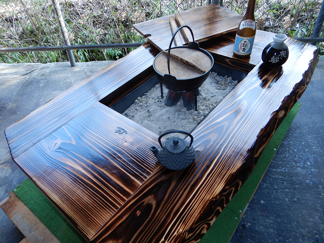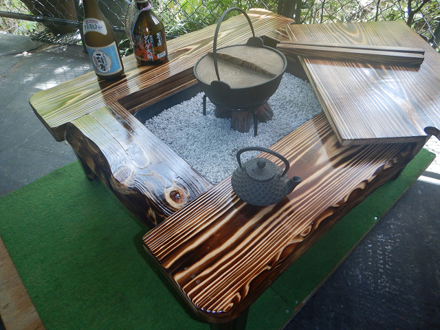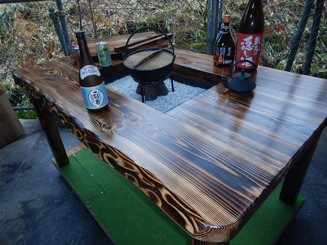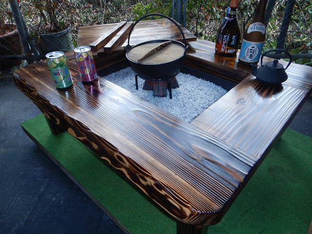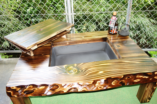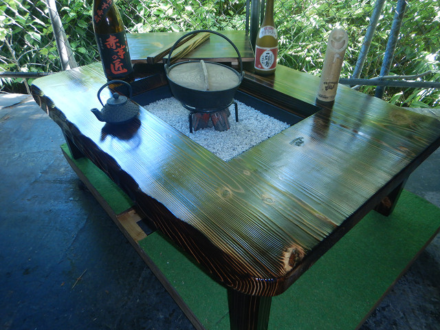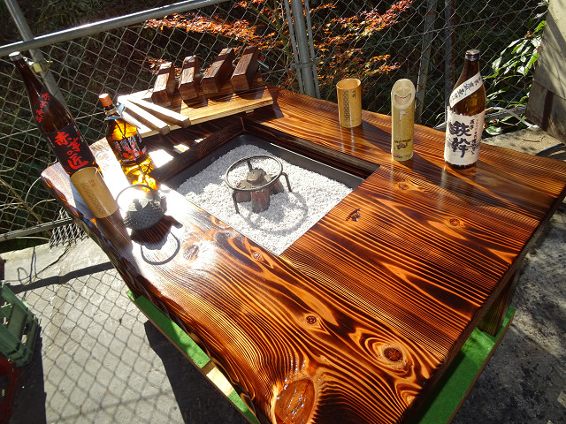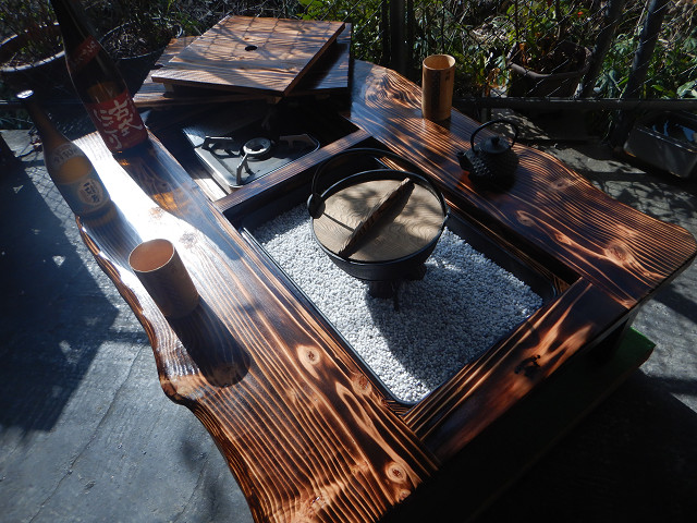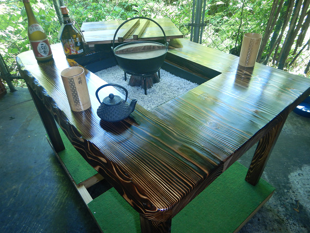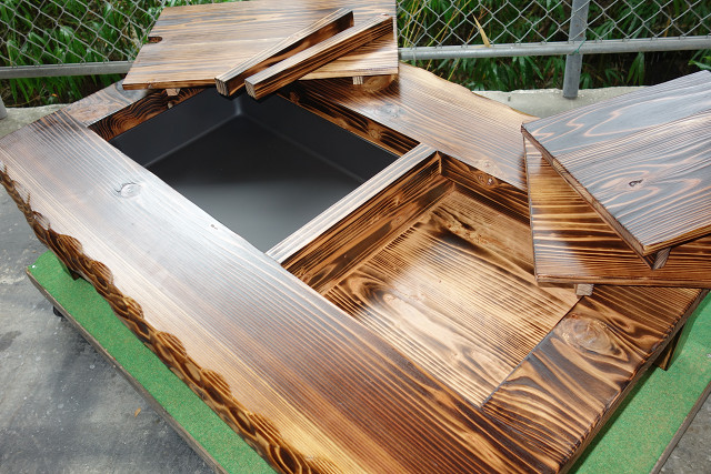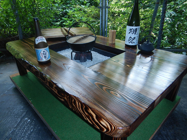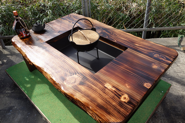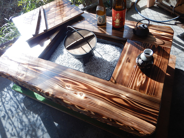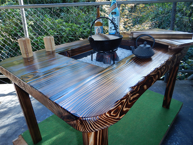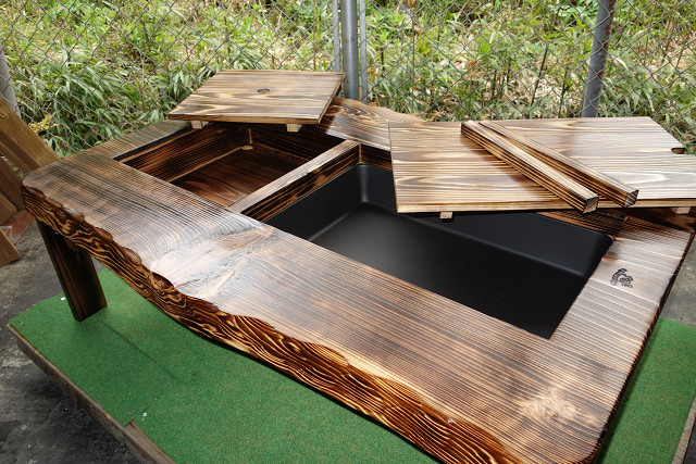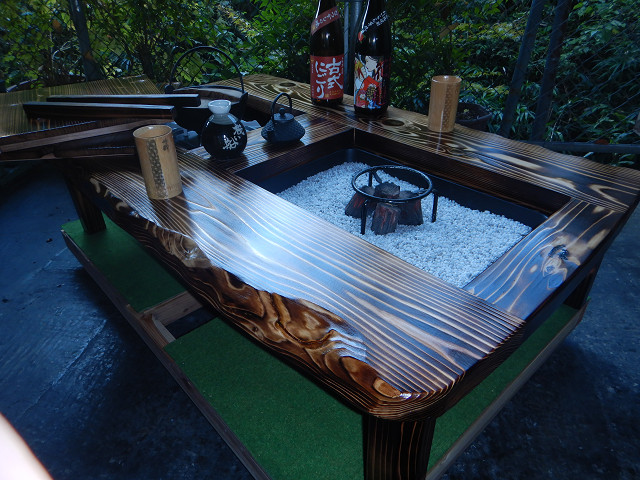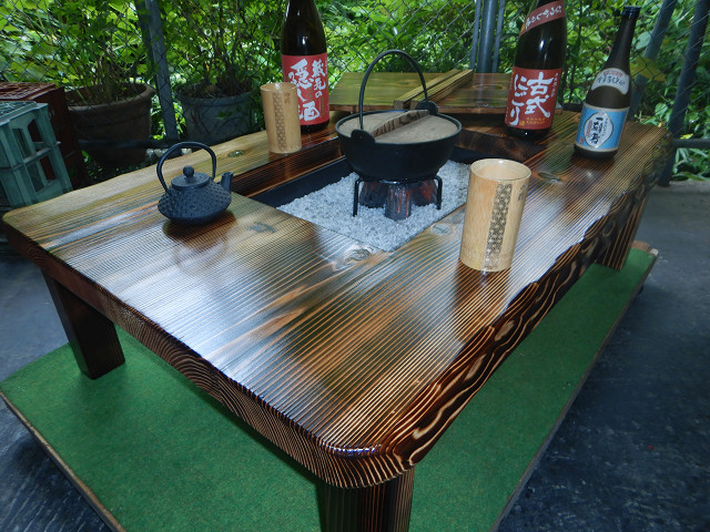 <ホ> 囲炉裏テーブル脚折れ式(完成薄い焼き色タイプ炉蓋とコンロ等使用時の上げ底板を付属 (神奈川県相模原市のSM様)