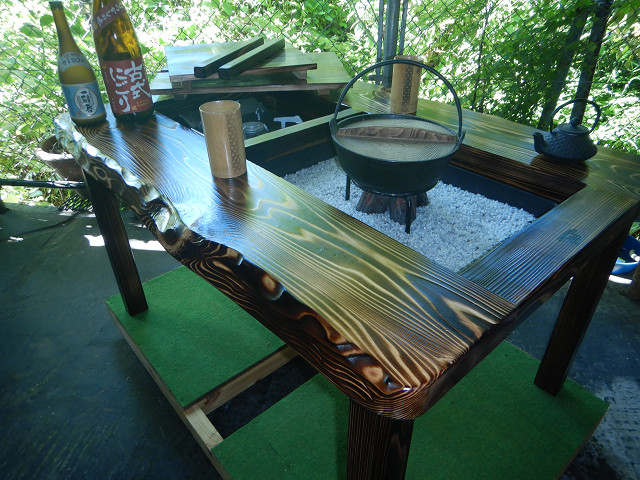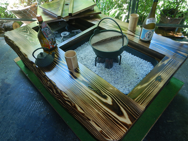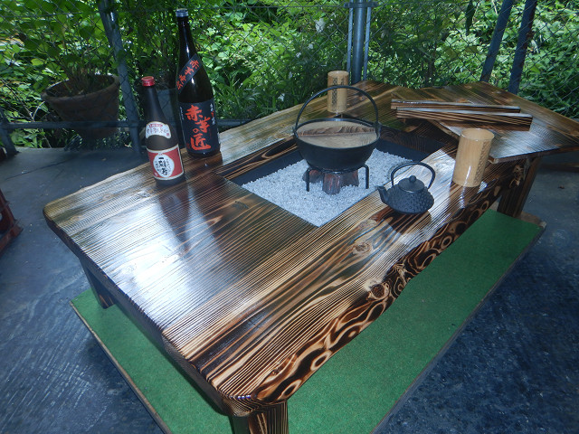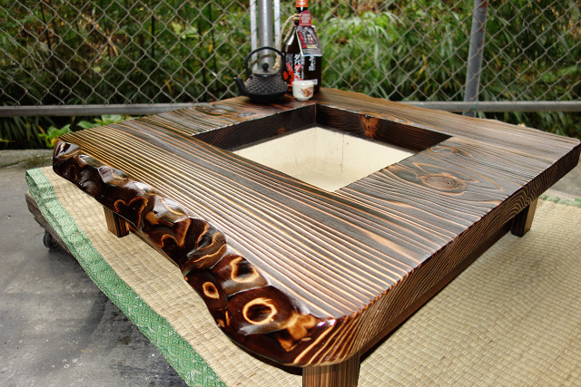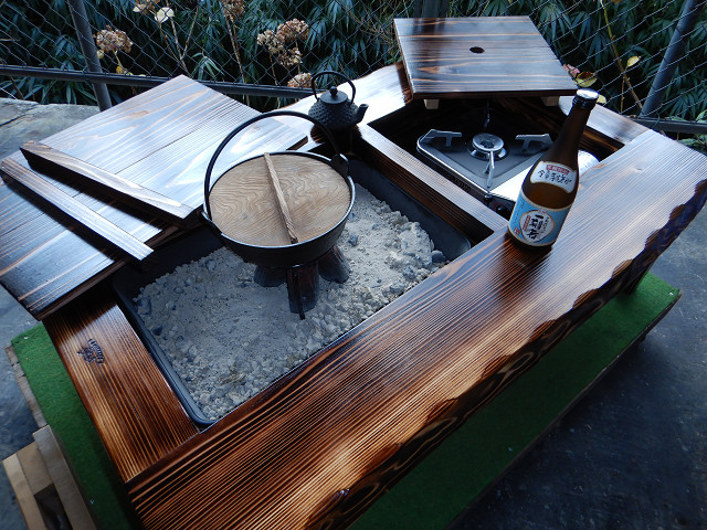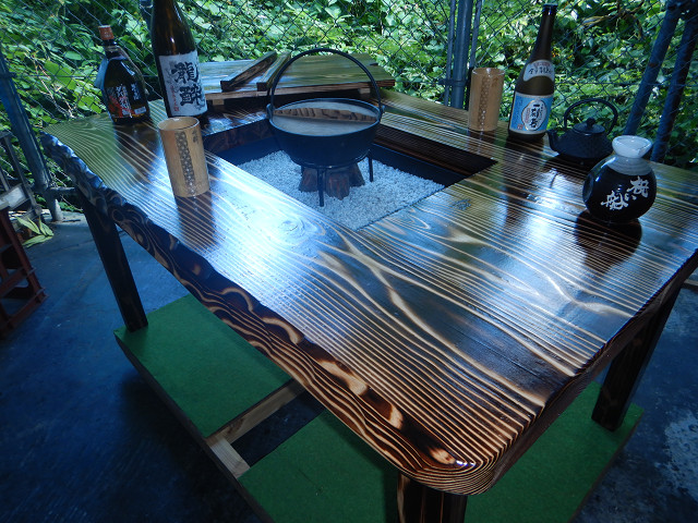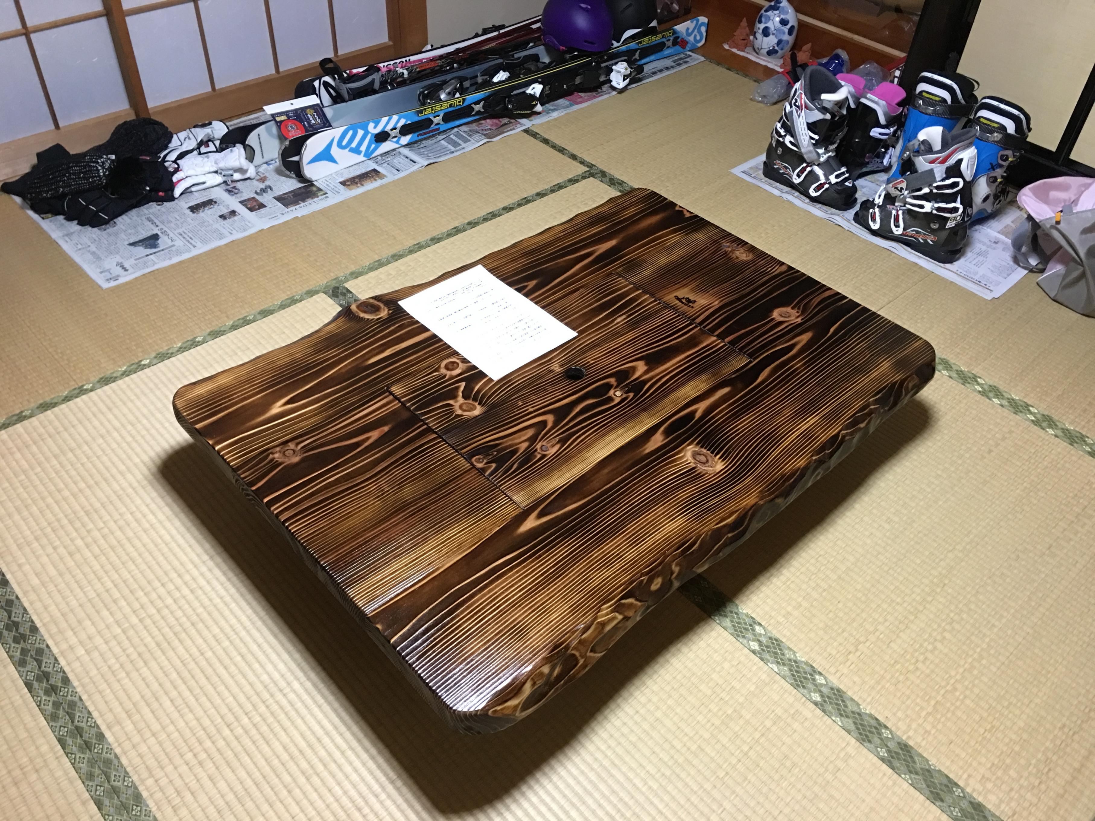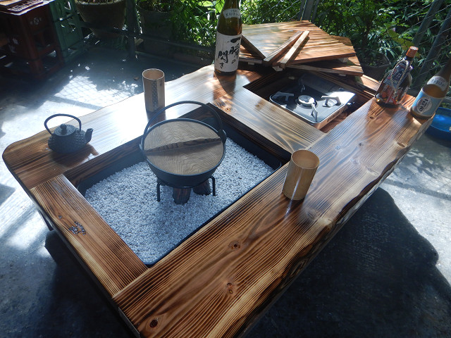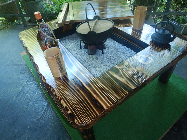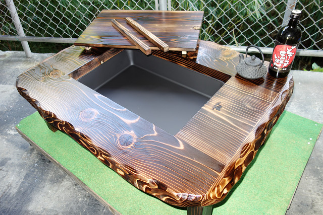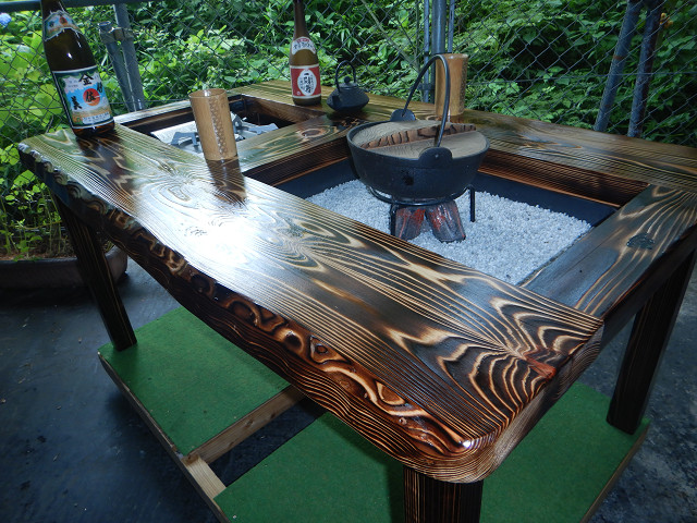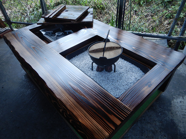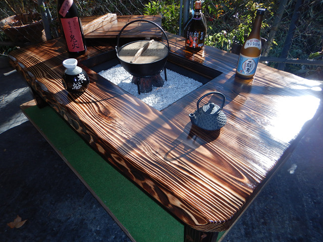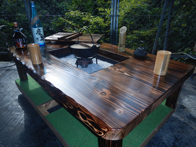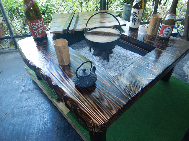 <ホ> 囲炉裏テーブル脚折れ式(完成薄い焼き色タイプ炉蓋とコンロ等使用時の上げ底板を付属 (神奈川県相模原市のSM様)