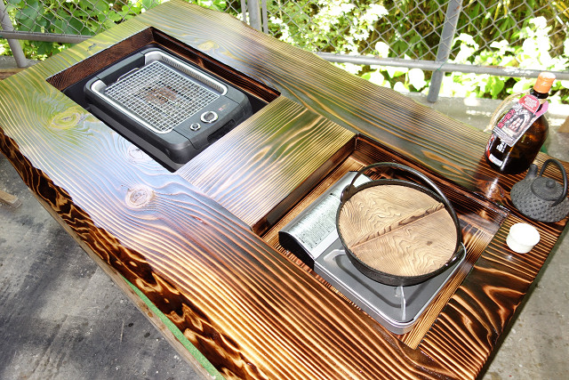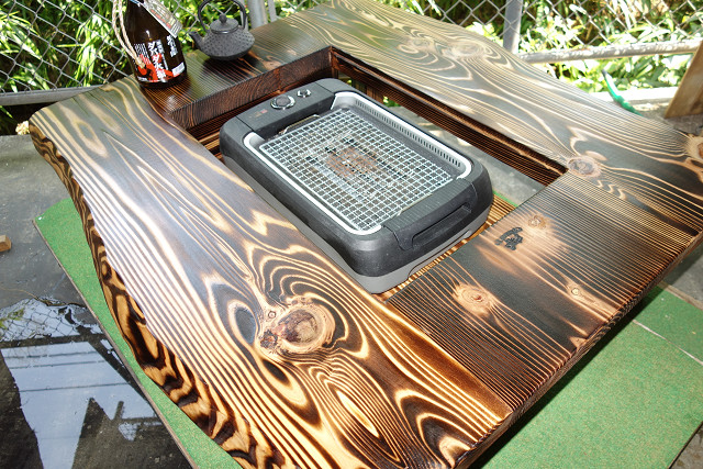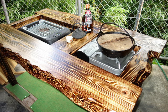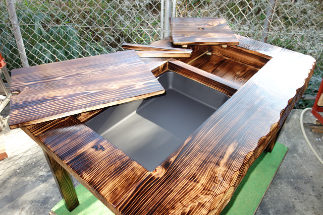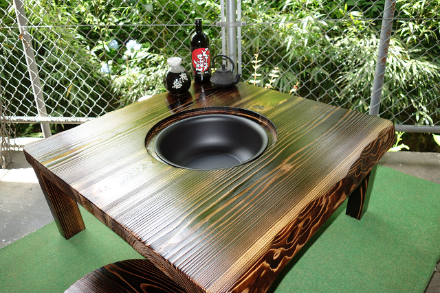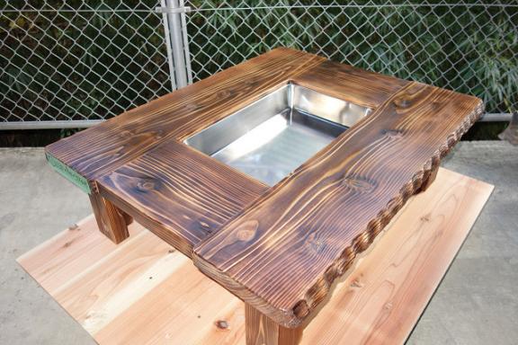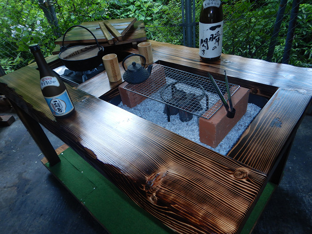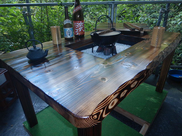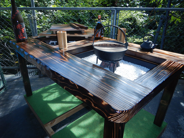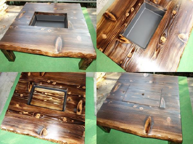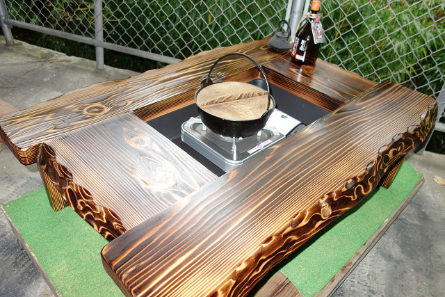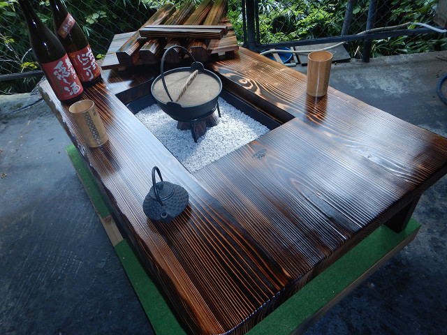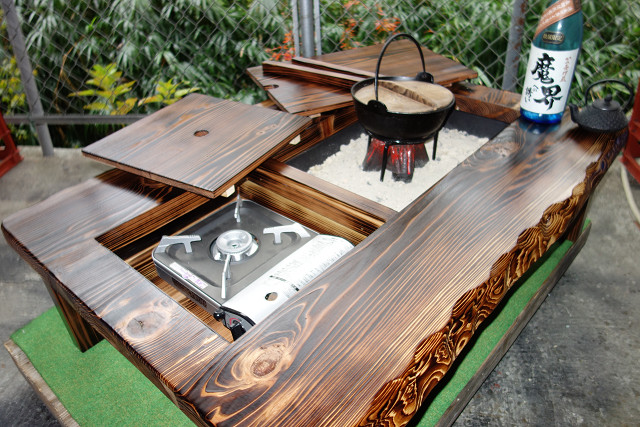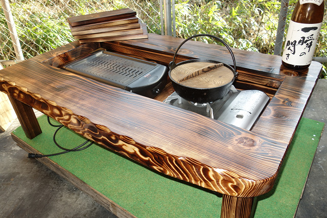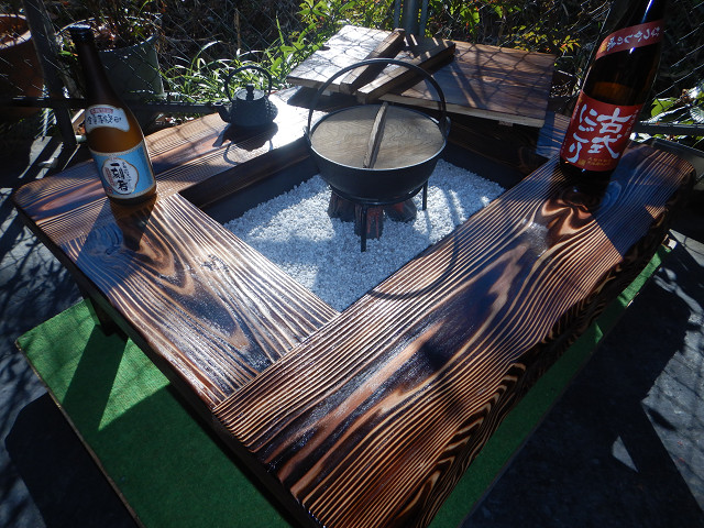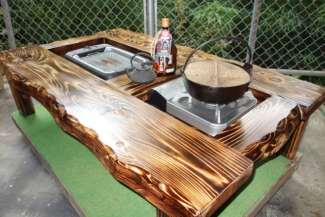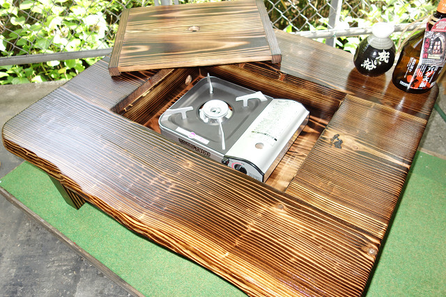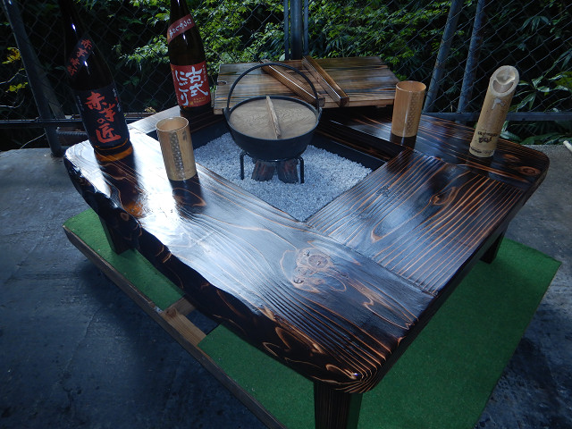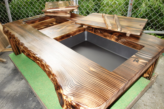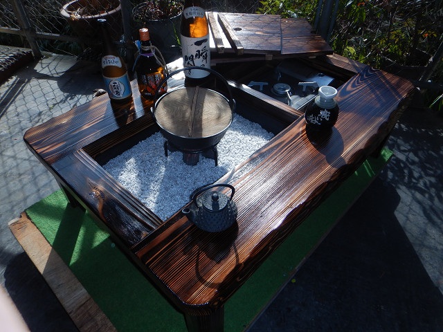 <ホ> 囲炉裏テーブル脚折れ式(完成薄い焼き色タイプ炉蓋とコンロ等使用時の上げ底板を付属 (神奈川県相模原市のSM様)