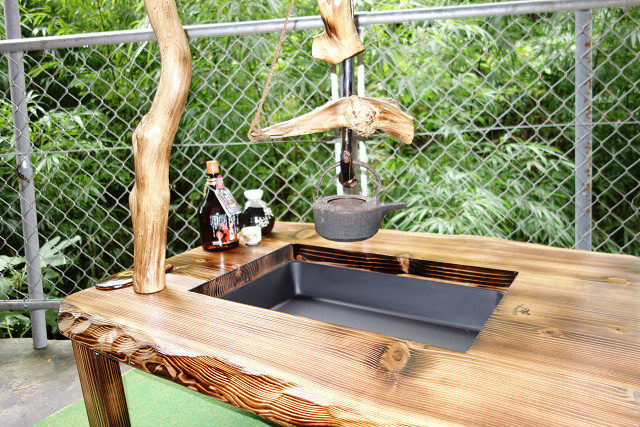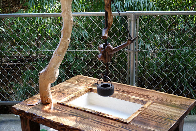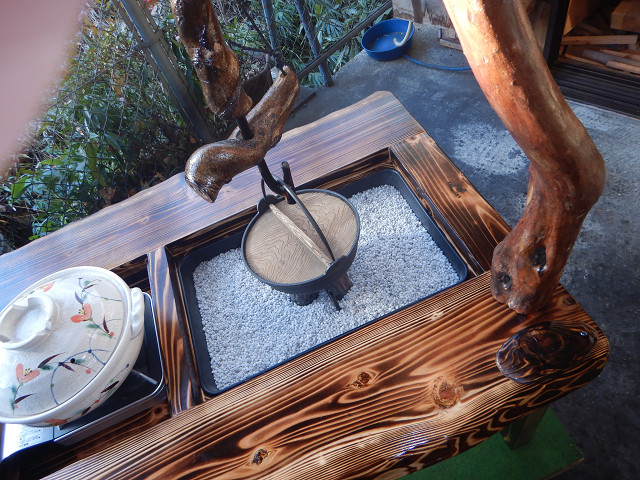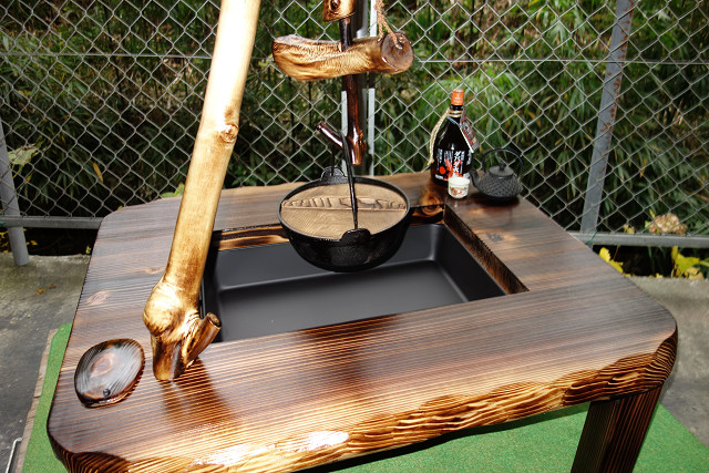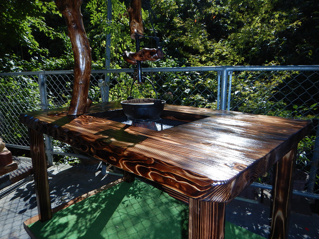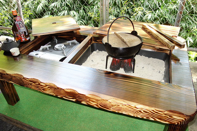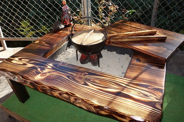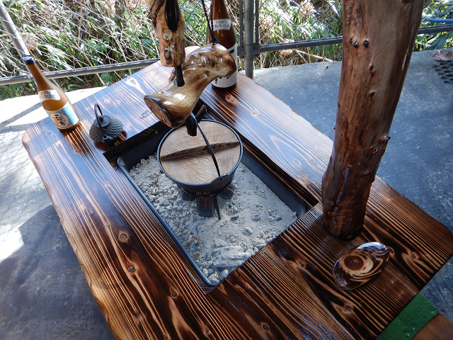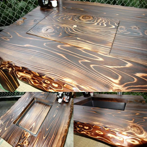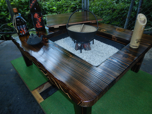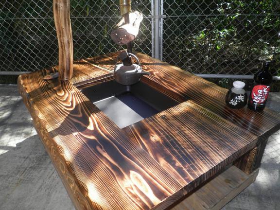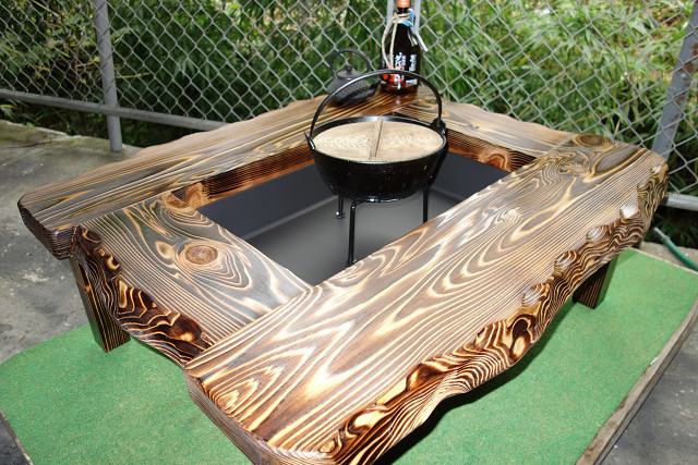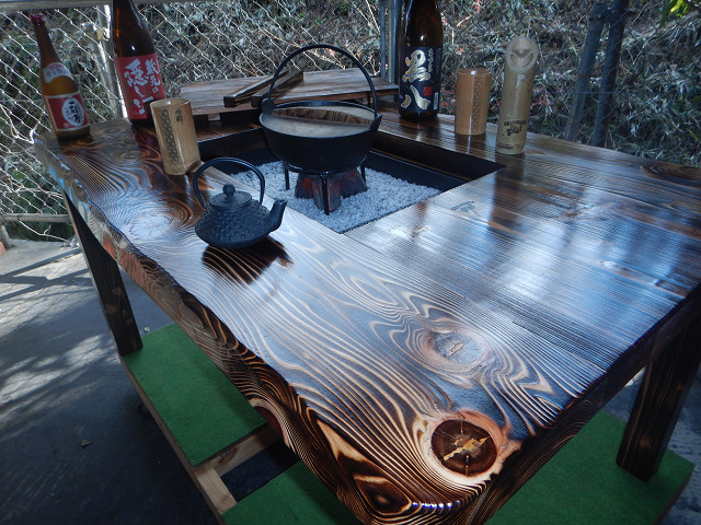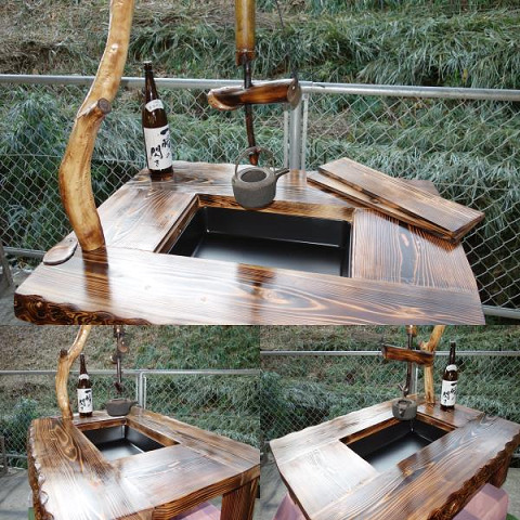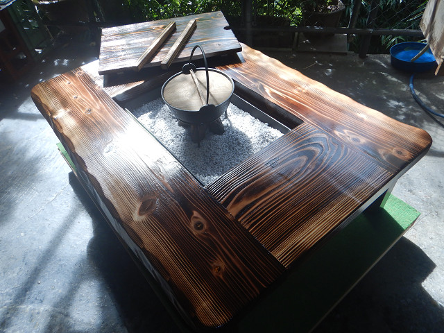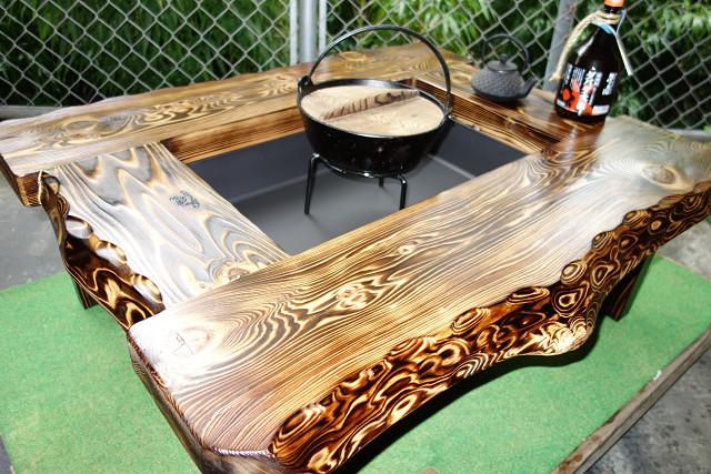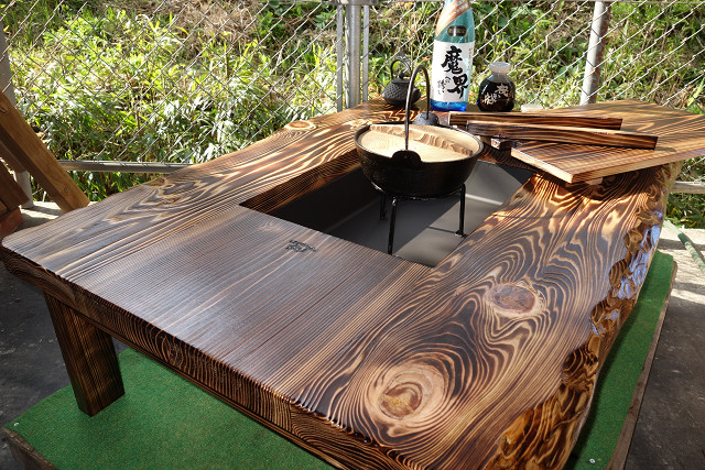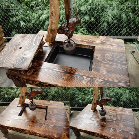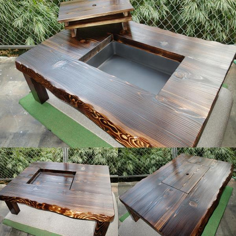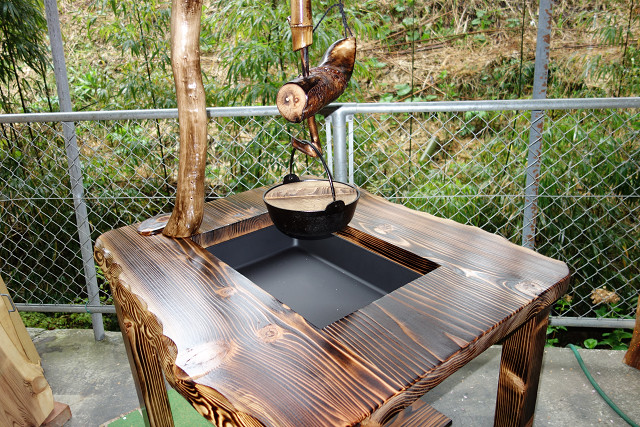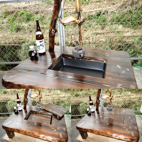 ②囲炉裏テーブル自在鉤 「炭火専用」土佐漆喰の炉+一部天然天板+自然界でも類を見ない究極絶品で奇跡の素晴らしい凹凸自在鉤支柱と幸運を掴んだかのような力強い握り拳の好バランス炉蓋を追加で製作脚折れ式(完成品)