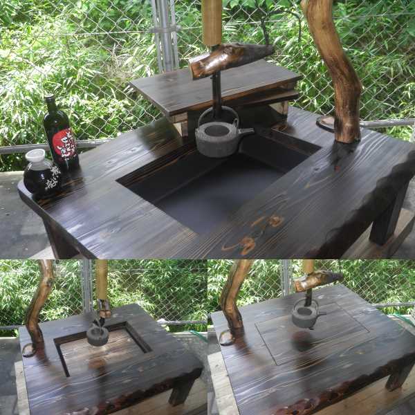 <直オーダー>囲炉裏テーブル(堀コタツ用).脚折れ式(完成品)炉蓋・コンロ等使用時の上げ底板付属.自在鉤は天井から吊るす本格的なようで