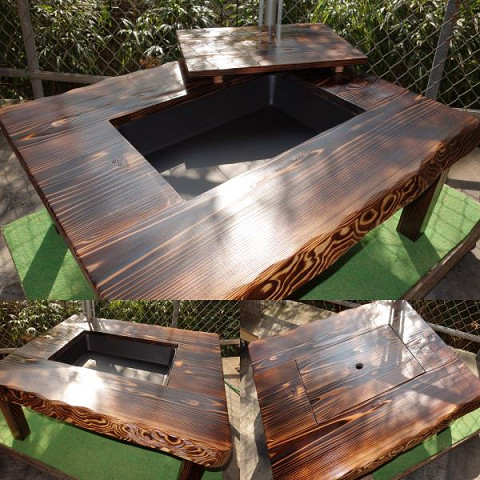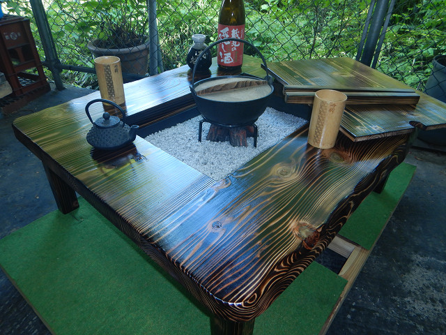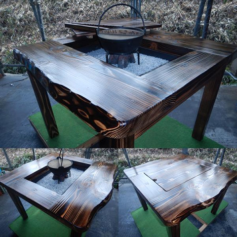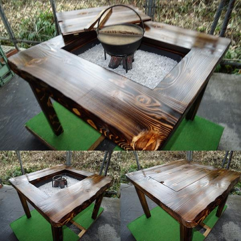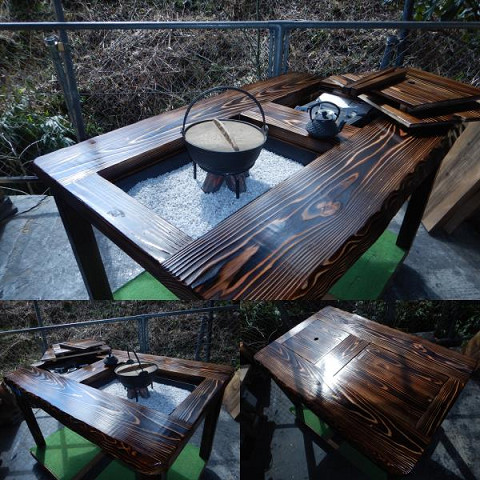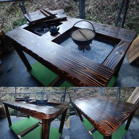 <ヤ> 囲炉裏テーブル ・脚折れ式(完成品)炉蓋とコンロ等使用時の上げ底板付属.少しコンパクトなタイプ(千葉県船橋市のAK様)とても作りが良く、素晴らしい囲炉裏テーブルでした。買って良かったです。まだ火は入れていませんが、使うのが楽しみです。大切に使いたいと思います。ありがとうございました。 嬉しい評価を頂き感謝致します。元気をもらい、やる気が湧いてきました。有難う御座いました。
