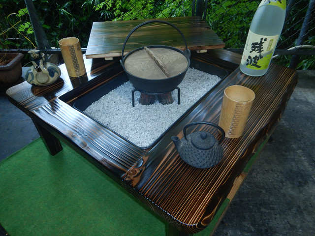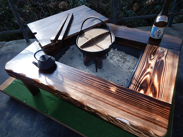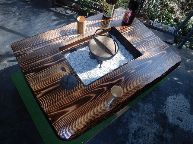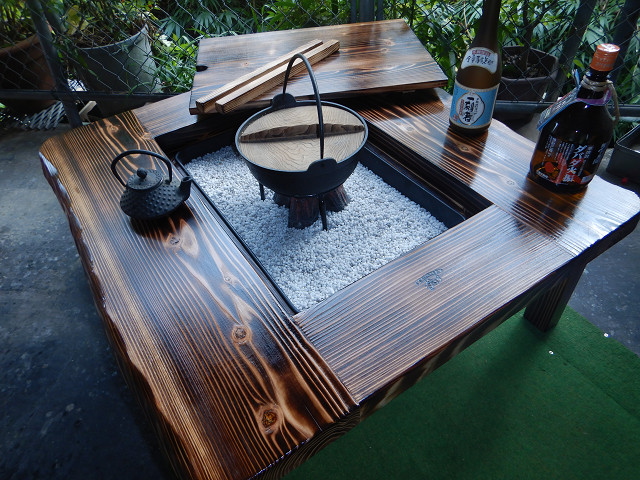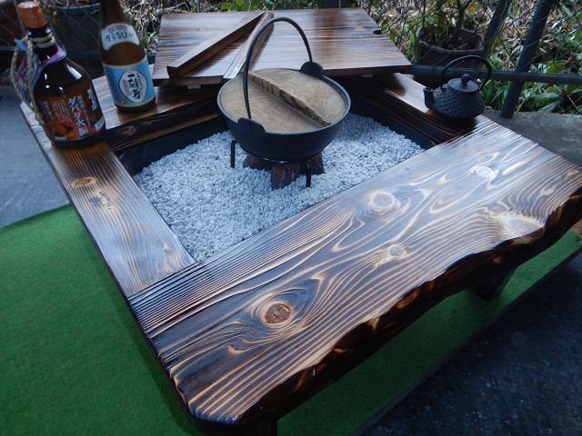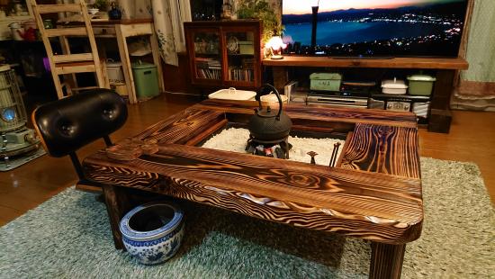 <オーダー> 置き囲炉裏テーブル・1,200Lx860W程度x190H,炉開口寸法=575x375x天板-135H.天板厚さ=50.炉蓋とコンロ等使用時の上げ底板付属.完成品(愛知県瀬戸市のYT様)完成の写真撮影を忘れて発送してしまいましたが、設置状況写真を送って頂きました。炉の中に珪藻土板を敷設しその上に灰を入れたとの事で更に安全が増します。良く勉強されています。更に、五徳と網があると非常に便利で究極の囲炉裏生活が出来ます。