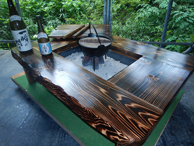 <ふ>土佐町ふるさと納税経由 囲炉裏テーブル・寸法=1,210x860~890程度x350H・炉開口寸法=580x405X天板-130H・凹スペース405x385x天板ー120H・隠れスペース400x500・天板厚さ=50・両方の炉蓋と角棒2本を付属(千葉県船橋市のHT様)有難うございました。