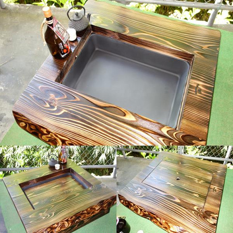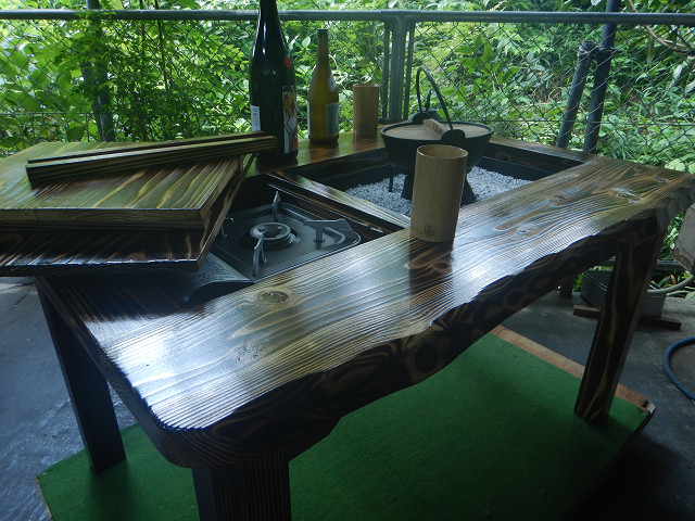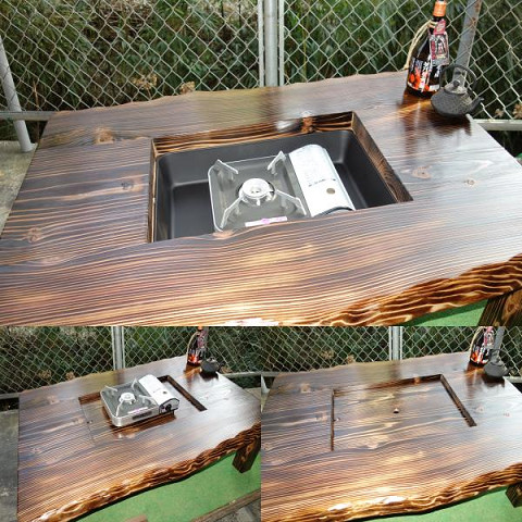 <ホ>囲炉裏風コンロ・七輪テーブル.寸法=1,000x840~910x350H.天板開口=600x375・据え付け床=天よりー85・135・200の3段スライド式.炉蓋は3枚分割(脚折れ式完成品) (千葉県船橋市のKK様)凄い作りだと喜んでんでいます。有難う御座います。何より嬉しい励みいと成ります。有難う御座いました。