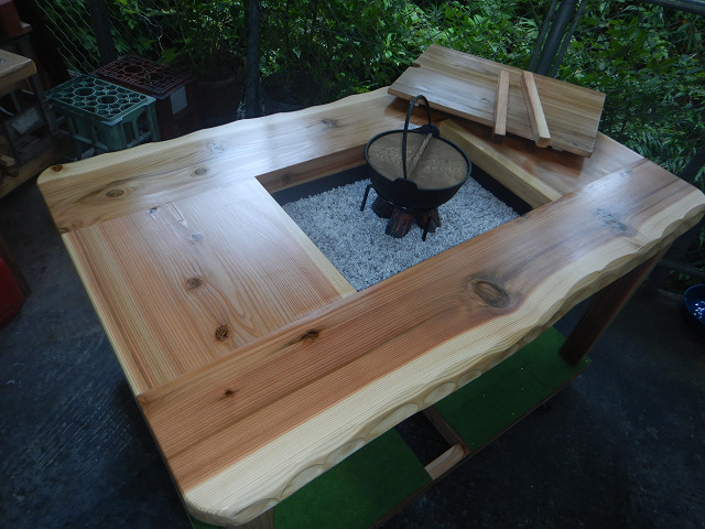 <ホ>囲炉裏テーブル・脚折れ式(完成品)自然の節々を強調した作り炉蓋とコンロ等使用時の上げ底板を付(京都府南丹市のWK様)リホーム建築に使用して頂けるとの事で現場に直送でした。有難う御座いました。次回の物件にも是非ご利用いただきたく存じます。