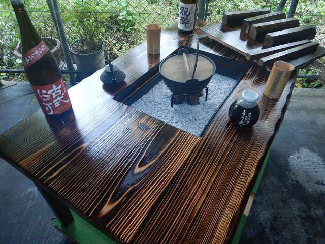 <ホ> 囲炉裏テーブル自在鉤付 炉が大きいタイプ 脚折れ式(完成品) 炉蓋・上げ底板付属 (東京都杉並区のYN様) 精魂詰めて作成したこの大きな素晴らしいテーブルを家族と友達と目一杯料理も酒も堪能しょうと思います. 趣味がアメゴ釣りだそうで、囲炉裏で焼くのが楽しみとの事でしたが炭火で焼く食材は全て美味しくなるので色々とお試し下さい。 有難う御座いました。