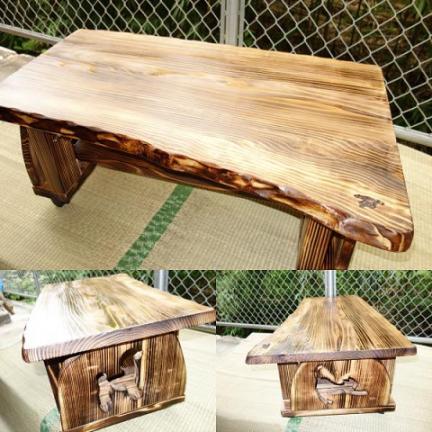 ②座卓テーブル脚折れ式(完成品)「T-9」ストッパー付ローラー付.棚板を付属.左右に犬猫シルエット切り抜き(滋賀県大津市のWK様)離れを改修して堀座卓式囲炉裏として使用との事でした。 同時に2台もご購入頂きまして有難う御座いました。まだ全国には助け船を出して頂ける方が大勢いると感じました、残る余生が喜びを感じなら一匹の蟻の気分で送れたらと思いながら、もう少し頑張って生きたい気持です。