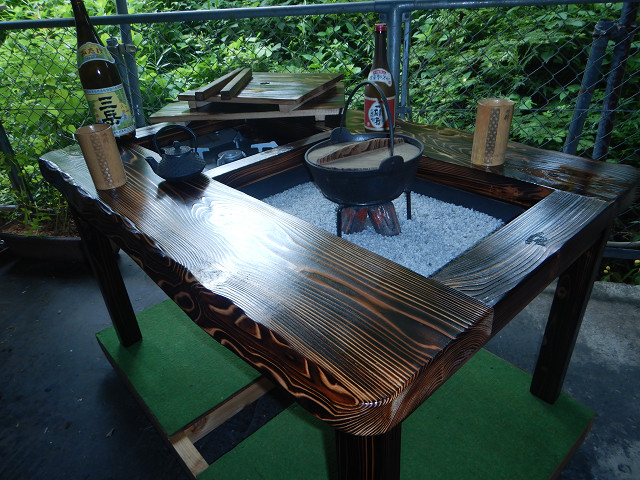 <ホ> 囲炉裏テーブル脚折れ式(完成薄い焼き色タイプ炉蓋とコンロ等使用時の上げ底板を付属 (神奈川県相模原市のSM様)