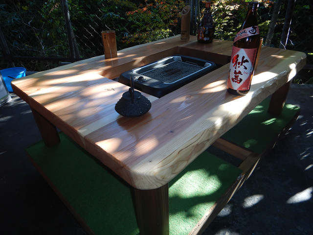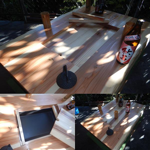 ③通常テーブルとして使用する場合には、「残り火は完全に消えた状態を確認」炉の天に付属の角棒を2本渡して炉蓋を乗せればフラットなテーブルになります。