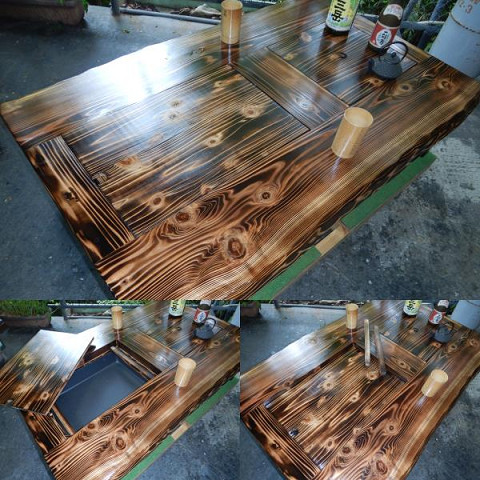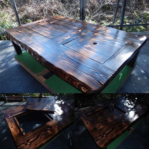 ③通常テーブルとして使用する場合には、「残り火は完全に消えた状態を確認」炉の天に付属の角棒を2本渡して炉蓋を乗せればフラットなテーブルになります。