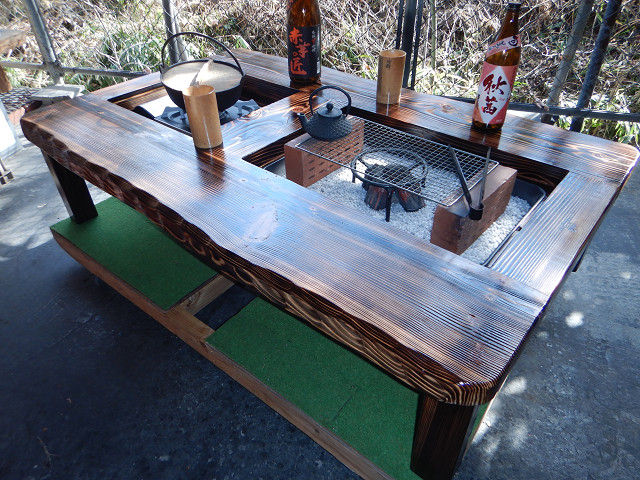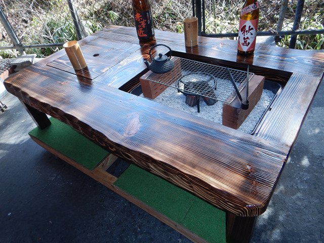 ④隣凹部へは、直接炭火使用は禁止で、七輪~IHコンロ~カセット式コンロ~フライヤー等の収まる器具を据付けて使用します。(電気コード等の通し穴もあります。)