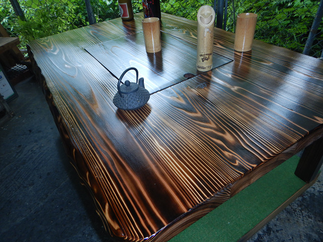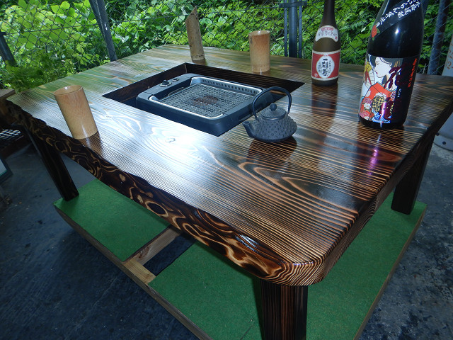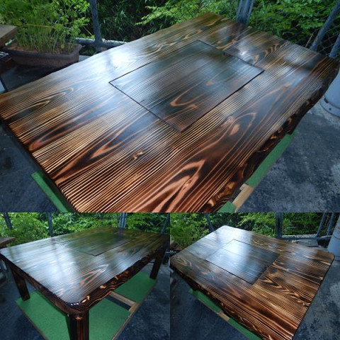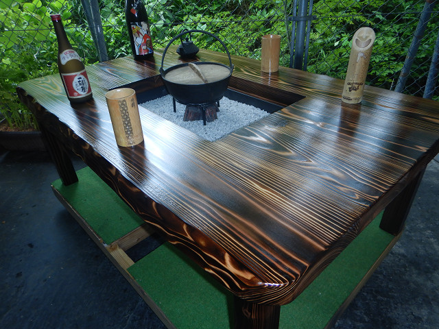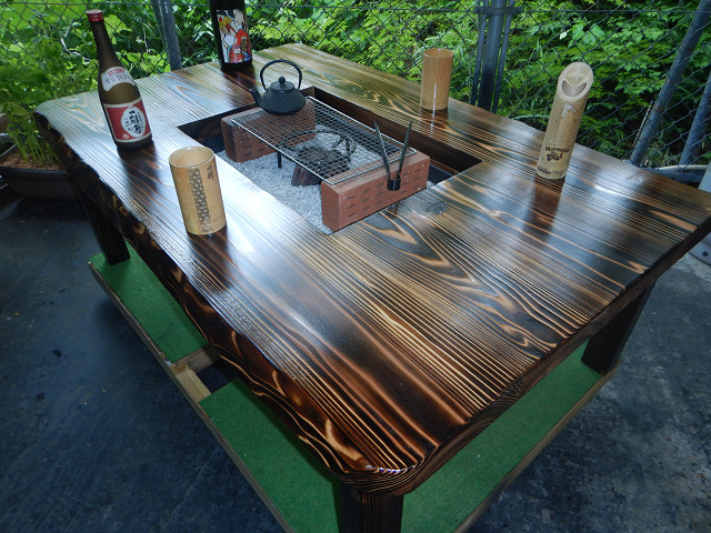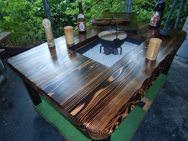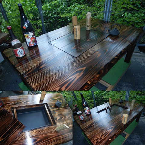 ③通常テーブルとして使用する場合には、「残り火は完全に消えた状態を確認」炉の天に付属の角棒を2本渡して炉蓋を乗せればフラットなテーブルとして使用