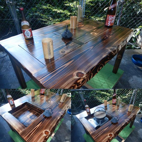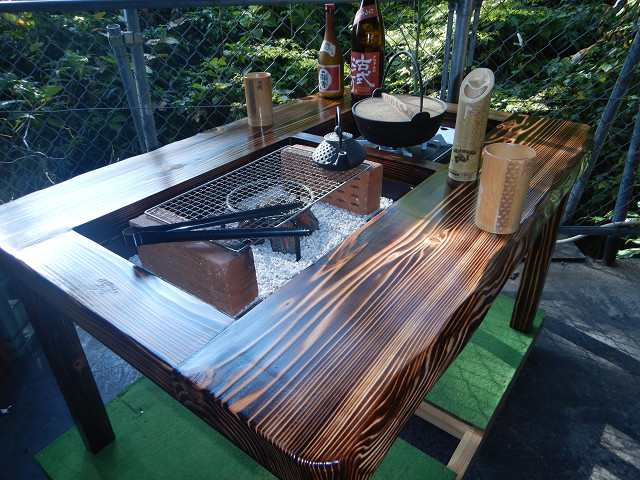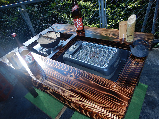 ④隣凹部へは、直接炭火使用は禁止で、七輪~IHコンロ~カセット式コンロ~フライヤー等の収まる器具を据付けて使用します。(電気コード等の通し穴もあります。)