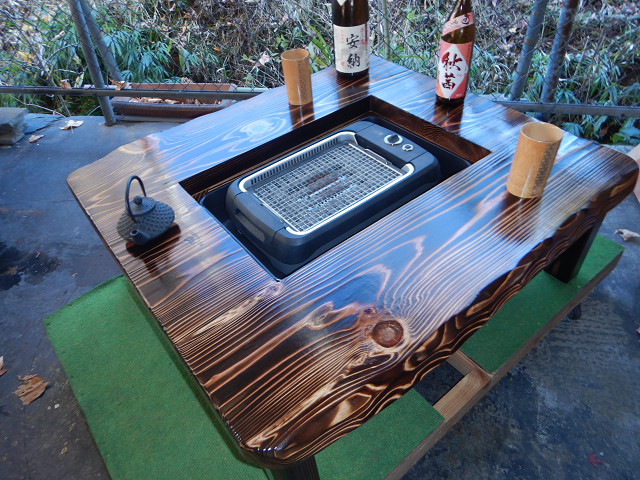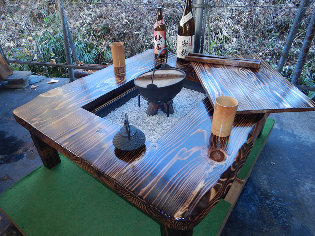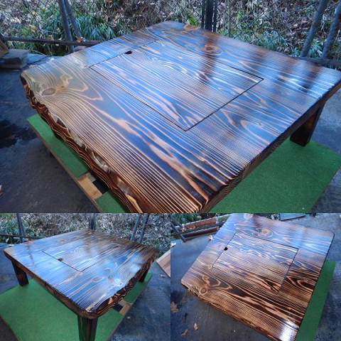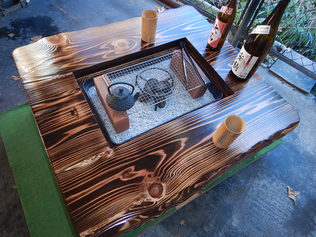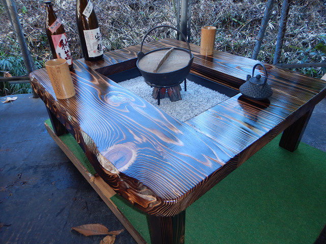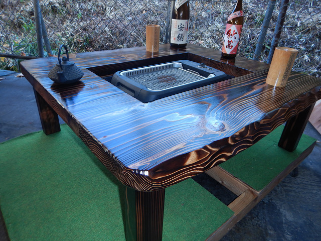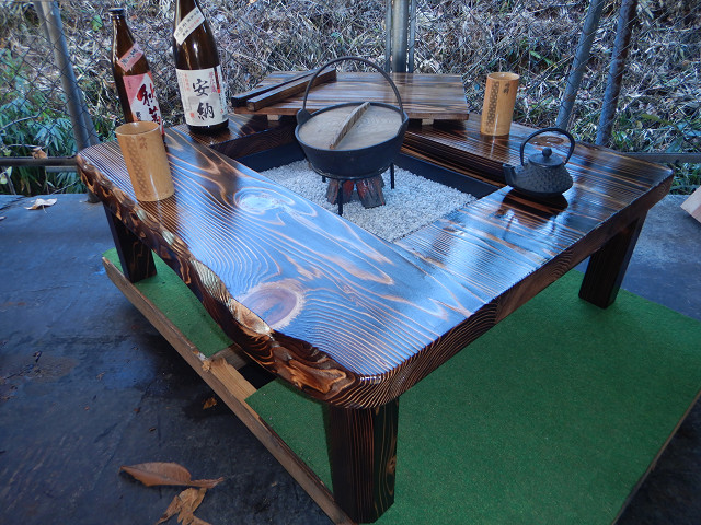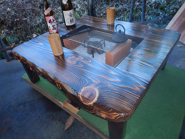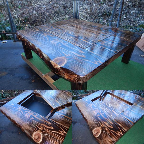 ③通常テーブルとして使用する場合には、「残り火は完全に消えた状態を確認」炉の天に付属の角棒を2本渡して炉蓋を乗せればフラットなテーブルになります。
