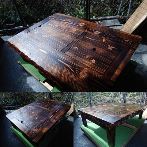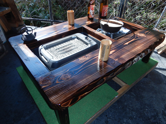 ③通常テーブルとして使用する場合には、「残り火は完全に消えた状態を確認」炉の天に付属の角棒を2本渡して炉蓋を乗せればフラットなテーブルになります。